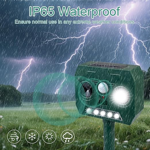 Su geçirmez ultrasonik hayvan kovucu – Gelişmiş ABS malzemelerden ve en yeni sızdırmazlık teknolojisi kullanılarak üretilmiştir. Bu güneş enerjisiyle çalışan bahçe kedi kovucu IP65 su geçirmez koruma sınıfına sahiptir. Açık havada şiddetli yağmura dayanabilir, ancak suya daldırılmamalıdır.
