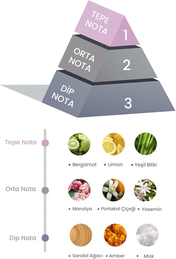 Koku Notaları: Alya Wave Marine oda kokusunun içeriğinde; Tepe notalarında bergamot, limon ve yeşil özler bulunur. Bergamotun canlandırıcı ve enerjik etkisi, limonun ferahlatıcı notası ve yeşil özlerin doğal aromasıyla birleşerek oda kokusuna canlılık ve tazelik katar. Bu notalar sayesinde yaşam alanlarınızda enerjik bir atmosfer oluşturabilirsiniz. Orta notalarda manolya, portakal çiçeği ve yasemin bulunur.