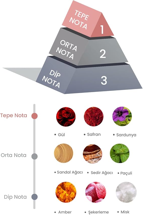 Koku Notaları: Tepe notalarında gül, safran ve sardunya bulunur. Gülün romantik ve zarif kokusu, safranın egzotik ve baştan çıkarıcı notasıyla birleşerek oda kokusuna etkileyici bir başlangıç sağlar. Sardunya ise tatlı ve çiçeksi aromasıyla bu mistik atmosfere güzellik katarken, kalbinizi sıcak bir şekilde kucaklar. Orta notalarda paçuli, sedir ağacı ve sandal ağacı bulunur. Paçulinin derin ve odunsu notası, sedir ağacının güçlü ve aromatik kokusuyla birleşerek odaya zenginlik katar. Sandal ağacının ise sıcak ve rahatlatıcı etkisiyle birlikte odanın atmosferine huzur verir. Dip notalarda amber, misk ve şeker özleri bulunur.