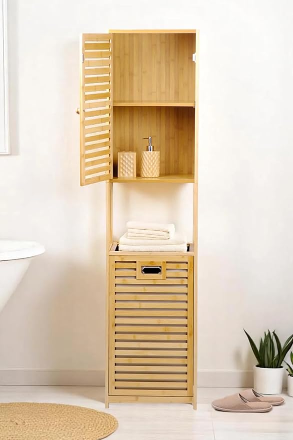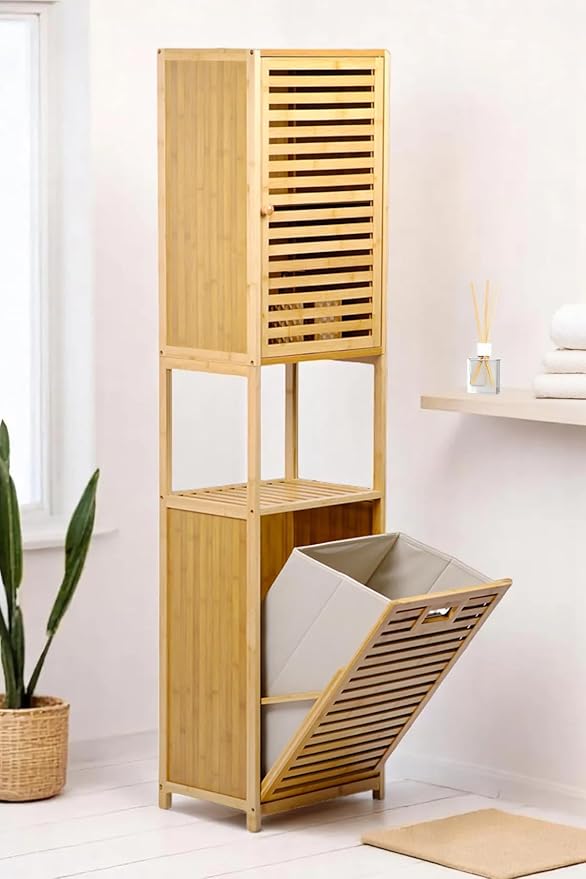 Bambu Kirli Sepetli 1 Raflı Kapaklı Banyo Dolabı Banyo Düzenleyici Çamaşır Sepeti Organizer DB-0010