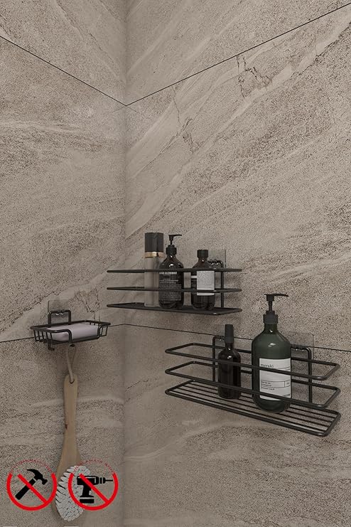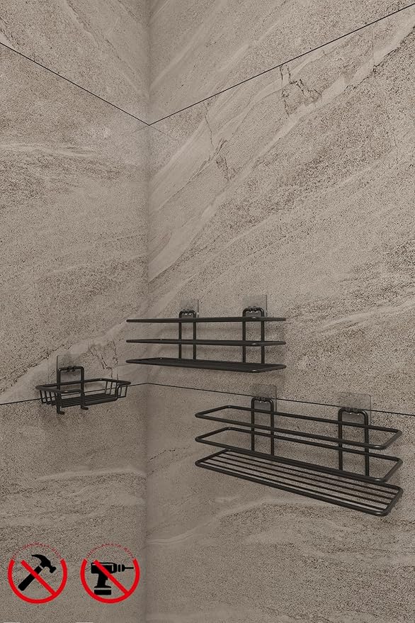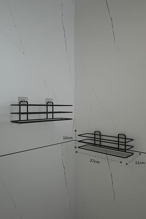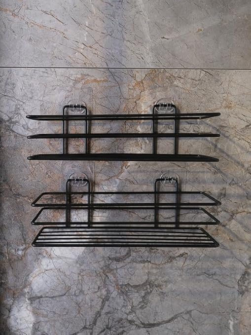 Banyo Yapışkanlı Kancalı Paslanmaz Siyah 2 Adet Düzenleyıcı Rafı Katı Sabunluk ve Bulaşık Süngerlik Seti