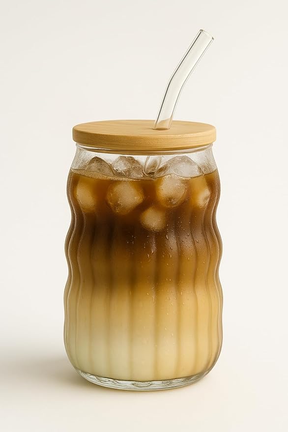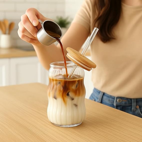Kahve Bardağı Isıya Dayanıklı Ice Latte Cam Pipetli Bardak Kahve Kokteyl Cam Sunum Bardağı Meşrubat Bardağı Bambu Kapaklı 400ml