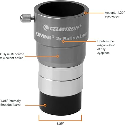 Mevcut merceğinize ek olarak takılan Barlow Lens 2 kat daha fazla yakınlaştırma sağlar. Örneğin 10 mm lik mercek ile kullanırsanız 5mm mercek ile görüntüsü alırsınız.