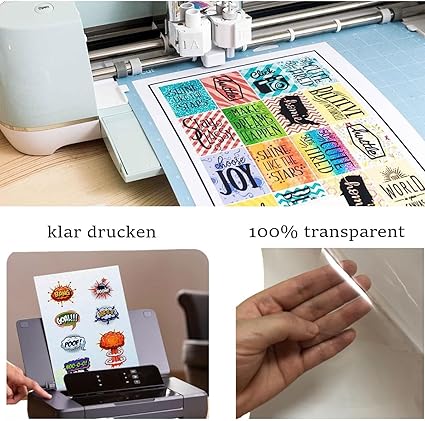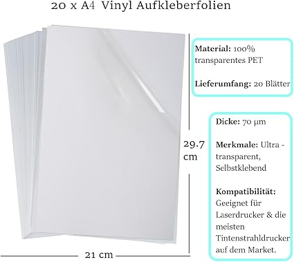 20 yaprak çıkartma folyosu: FOLANDO şeffaf çıkartma kağıdı seti, kendinden yapışkanlı folyolu 20 yaprak A4 kağıt içerir. Lazer yazıcı ve mürekkep püskürtmeli yazıcı için uygundur.