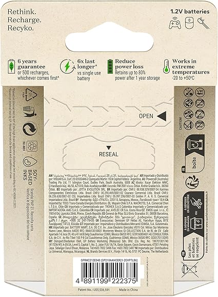 Ürün özellikleri; Kapasite: 2100mAh Boyut: AA Gerilim: 1.2V Şarj tutma: 12 ay sonra %80’e kadar Çevrim Ömrü: 500 döngüye kadar Çalışma sıcaklığı: -20°C ila +50°C >%10 geri dönüştürülmüş malzemeler Ağırlık: 27,2 g