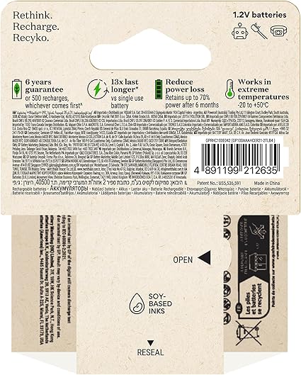 Yüksek performanslı, uzun ömürlü ve gezegen için iyi bir NiMH şarj edilebilir AAA pil. 500 kata kadar çevrim ömrüne sahip bu dört pil paketi, 4.000 tek kullanımlık pile* eşdeğerdir. Önceden şarj edilmiş ve kullanıma hazır, düşük kendi kendine deşarj oranı sayesinde 12 ay sonra %50’ye kadar şarjlı kalabilir. -20°C ile +50°C arasında değişen çalışma sıcaklığıyla, zorlu ortamlarda bile güvenilir performans sunar.
