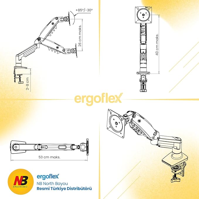 ① NB F80 resmi Türkiye distribütörü Bizbize Elektronik , Ergoflex garantisi ile en son versiyonu ile sisteminize değer katıyor.Monitörünüzün yüksekliğini ve açısını ayarlama özgürlüğünün tadını çıkarın. Nb F80 güçlü bir monitör koludur ve ergonomik bir konfor içinde çalışabilmeniz için monitörünüzü ihtiyacınız olan yere yerleştirmenize olanak tanıyan bir ergonomi etkileşimli ekran koludur. İzleme konforunu artırmaya ve göz, sırt ve boyun yorgunluğunu azaltmaya yardımcı olur. Yüksekliği ayarlanabilen kol, daha fazla çalışma alanı sağlar, kullanılmadığında masayı veya masaüstü alanını boş bırakır.