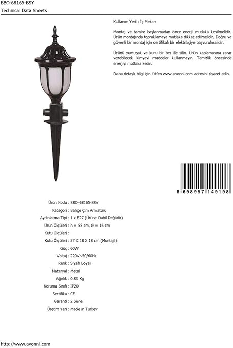 1 adet E27 duy ile max. 60W’lık ampül kullanılabilir