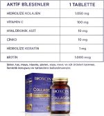 İçeriği İçerik 1 Tablet %BRD Hidrolize Kolajen 1.050 mg * Vitamin C (L-Askorbik Asit) 100 mg %125 Hyalüronik Asit 10 mg * Çinko (Çinko Sülfat) 10 mg %100 Hidrolize Keratin 1 mg * Biotin 1.000 mcg %2000 BRD: Besin Referans Değeri * Besin Referans Değeri bulunmamaktadır
