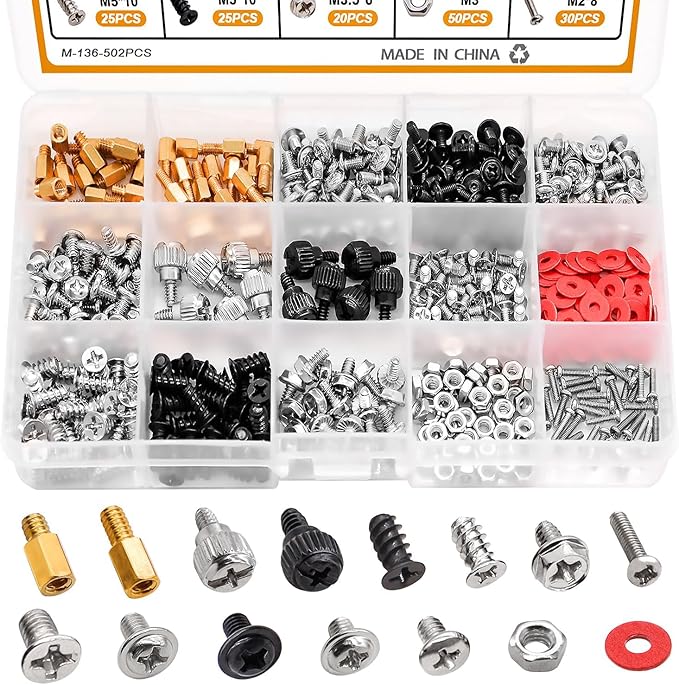 İhtiyaçlarınızı karşılamak için yeterli 502 bilgisayar vida seti vardır. Şeffaf bir plastik kutuda her boyuttaki bilgisayar vidaları ayrı olarak sıralanır, böylece taşıma ve ayırt etme kolaylığı sağlanır.