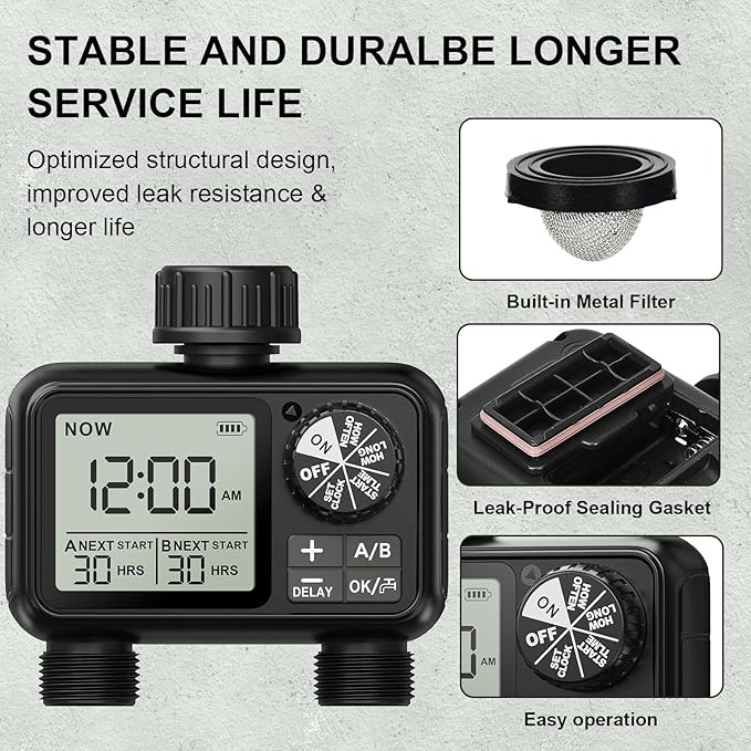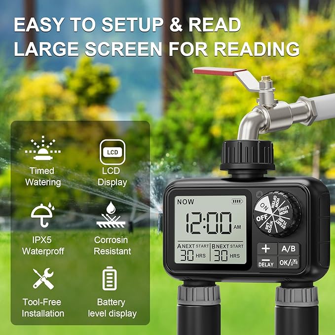 LCD ekran: Zamanlayıcı, sulama süresi, sulama sıklığı, kalan güç vb. gibi ayrıntıları net bir şekilde okuyabileceğiniz bir LCD ekran ile donatılmıştır. IPX5 su geçirmezlik sınıfı sayesinde hem su akımlarına hem de yağmurlu hava koşullarına karşı korunursunuz, böylece çok sayıda dış mekan kullanımı için mükemmeldir.