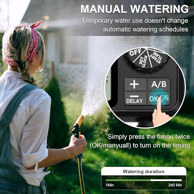 Manuel mod: Manuel sulama modu, her çim veya bahçenin ihtiyaca göre hızlı ve esnek bir şekilde sulanmasını sağlar. Yağmur gecikmesi, ok tuşuna 2 saniye boyunca uzun süre basılması, bir sonraki sulama döngüsünü hızlı bir şekilde geciktirmenize, rahat ve kolay bir şekilde su tasarrufu yapmanıza yardımcı olur.
