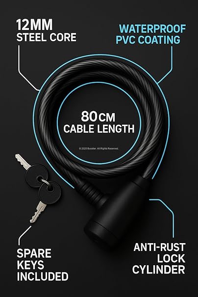 Bisiklet Kilidi, 80 cm Uzunluk, 12 mm Kalınlık, Su Geçirmez PVC Kaplama, Çelik Gövdeli, Yedek Anahtarlı, Güvenlik Kilidi, Dış Mekan Kullanıma Uygun