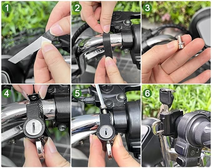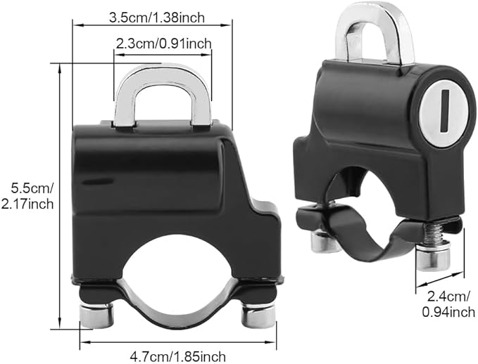 Motosiklet kask kilidi, piyasadaki 2,2 – 2,6 cm boru çapına sahip yaygın motosikletlerin, scooterların ve bisikletlerin gidonlarına ve arka tamponlarına montaj için uygundur. Alyan anahtarı ile hızlı ve kolay kurulum ve sökme.