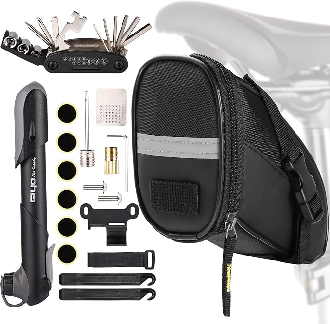 Çok amaçlı bisiklet kiti: Bisiklet sele çantamız, 16’sı 1 arada onarım aleti, 1 x mini bisiklet pompası, 2 x kol lastik çubuğu, 6 x yapışkansız lastik ve 2 x metal rasp, 1 x 4 mm alyan anahtar, 2 x bisiklet supap adaptörü. Acil durumlarda bisikletleri onarmak için çok pratik bir alet, ancak günlük kullanım için alternatif bir alet olarak da kullanılabilir.
