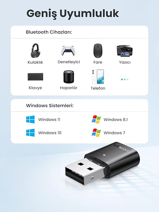 Uyumlu Cihazlar: USB Bluetooth 5.0 Adaptörü,Bluetooth kulaklıklar,hoparlörler,klavyeler, fareler,yazıcılar,PS4/PS5/X Box One S gamepad’ler (Ana bilgisayarlar desteklenmez) ve diğer cihazlarla uyumlu, aynı anda birden fazla Bluetooth cihazının bağlanmasını destekler (Not: Xbox tutamacı desteklenmez; Ses cihazları birer birer bağlanabilir).