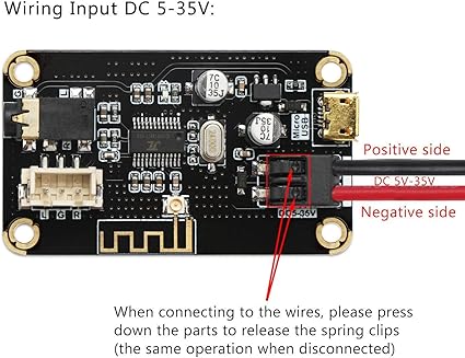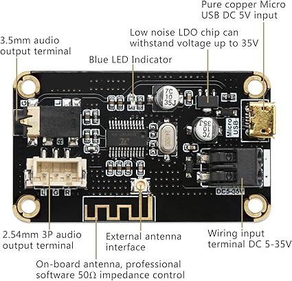 Bluetooth alıcı modülü DC 5 – 35 V geniş bir giriş gerilimi aralığına sahiptir ve mikro USB 5 V güç kaynağını destekler.