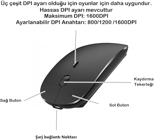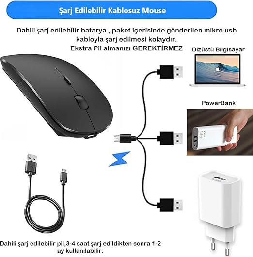 Şarj edilebilir kablosuz Mouse : Dahili Li-polimer piller, yüksek çevrim ömrü, mikro USB kablosuyla kolayca şarj edilebilir Dahili şarj edilebilir pil,3-4 saat şarj edildikten sonra 1-2 ay kullanılabilir.), ekstra AAA pillere gerektirmez