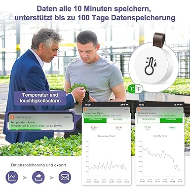 【Sıcaklık ve nem için veri aktarımı】: Bluetooth termometremiz 100 gün boyunca veri toplayabilir ve size sıcaklık ve nem trendlerine genel bir bakış sunmak için grafiklerde sunabilir. CSV formatında veri aktarımını destekler ve size hassas bir trend akışı sunmak için sürekli olarak her 10 dakikada bir veri seti kaydeder.