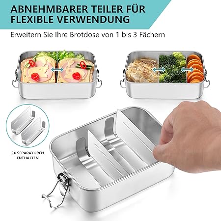 Bölmeli beslenme kutusu, paslanmaz çelik beslenme kutusu, çocuklar ve yetişkinler için, çıkarılabilir ayırma duvarlı, piknik, okul ve yolculuk için, sızdırmaz ve bulaşık makinesinde yıkanabilir