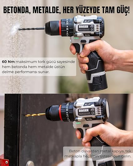 ⚡ 60 Nm Maksimum Tork Gücü Zorlu yüzeylerde bile yüksek performans ve hızlı delme-vidalama işlemleri sunar. Her türlü tamirat ve montaj işinizde güçlü bir yardımcı!