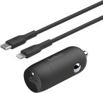 BOOST↑CHARGE™ 30W Hızlı Araç Şarj Cihazı, USB-C Güç Dağıtım Portlu Kompakt Tasarım, USB-C – Lightning Ara Kablosu Dahil, iPhone 16 Serisi, iPad ve Daha Fazlası için Evrensel Uyumluluk – Siyah