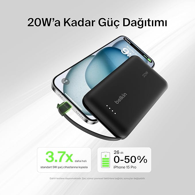 20W ÇIKTI İLE AKILLI TELEFONLARI VE TABLETLERİ HIZLI ŞARJ EDİN: Belkin taşınabilir şarj cihazı, akıllı cihazlarınızı hızlı şarj etmenizi sağlayan güçlü bir 20W çıkışa sahiptir. Hızlı şarj süreleri ile cihazlarınız her zaman kullanıma hazır olsun.