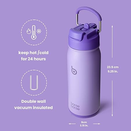 BOTTLE Paslanmaz Çelik Çocuk Su Şişesi 16 oz (470 ml) Yalıtımlı Spor Su Şişesi Hasır ve Hap Tutucu Hediyeler ve Okul için (Mor)
