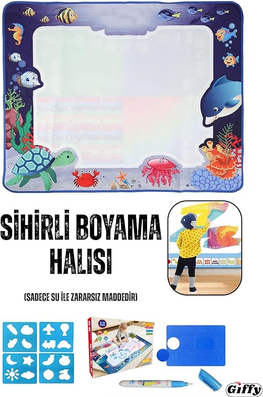 Boyama Halısı, Hayvanlar Temalı,Su İle Boya 10 Dakika Sonra Tertemiz, Renkli Resim Boyama Kitabı Hediyeli, Geometrik Baskı Ve Çizim Karoları Hediye, Su Kalemi İçinde Hediye (Deniz Canlıları)
