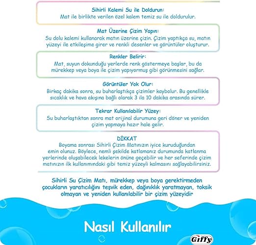 Bu sebeple sihirli halıda hiçbir boya malzemesine ihtiyaç duymadan boyama veya çizim yapabilirsiniz. Harici boyalar ile kullanılmaz.