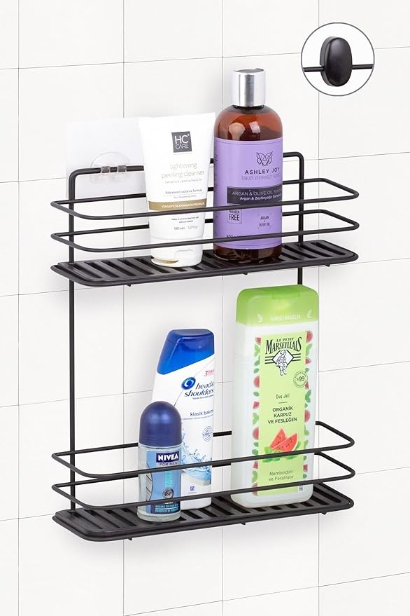 Boyu Paslanmaz Yapışkanlı Banyo Düzenleyici Şampuanlık 2 Katlı Duş Rafı Siyah Mds-836