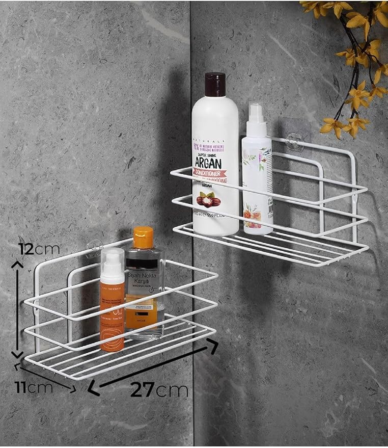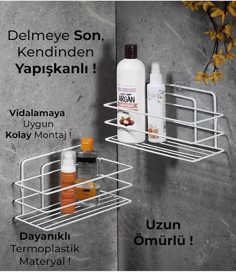 Boyu Paslanmaz Yapışkanlı Banyo Düzenleyici Şampuanlık Duş Rafı 2 Adet Beyaz Tş-01