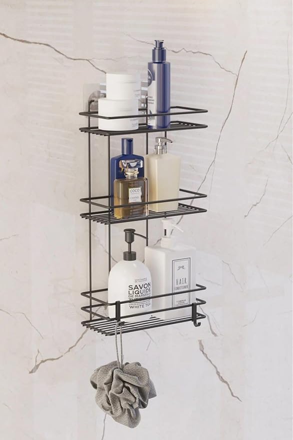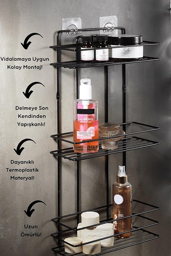 Boyu Paslanmaz Yapışkanlı Düz Banyo Düzenleyici Şampuanlık Duş Rafı Siyah Kancalı Tş-03