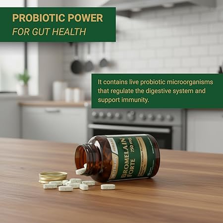 Bromelain Forte – 750 mg Bromelain, Yeşil Çay Ekstresi, Krom ve Probiyotik İçeren Sindirim ve Bağışıklık Destek Tableti – 60 Tablet – Alerjen İçermez