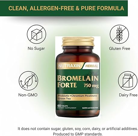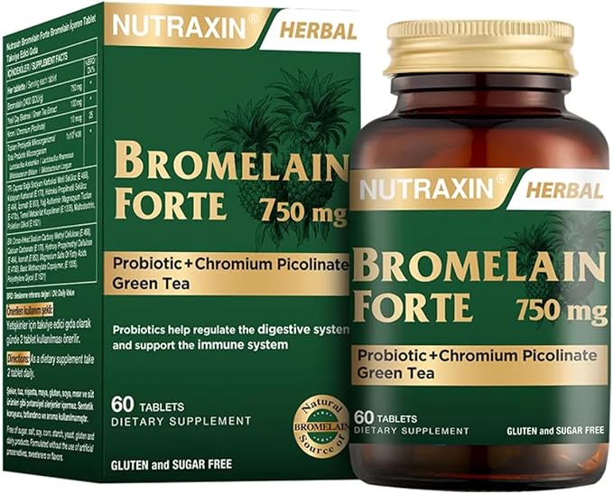 Nutraxin Bromelain Forte; ananastan elde edilen ve proteinleri sindiren enzim olan bromelain (2400 GDU/g), Yeşil çay ekstresi, Krom ve Probiyotik içerir.