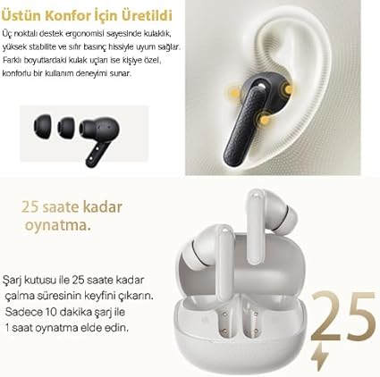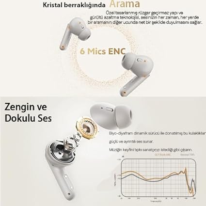 45 dB’ye kadar adaptif aktif gürültü engelleme ve altı mikrofonlu ENC teknolojisi sayesinde rüzgarlı, kalabalık veya toplu taşıma ortamlarında net ses ve çağrı kalitesi sunarBio-diyafram sürücüler ve dokuz farklı EQ modu ile bas, tiz ses ve kişiselleştirilebilir ses deneyimi sağlar25,5 milimetre boyutunda, hafif ve üç noktadan destekli ergonomik tasarımıyla kulakta oturur, farklı boy silikon uçlarla uyum sağlar
