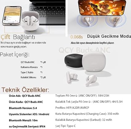ANC açıkken dört saat, kapalıyken beş buçuk saat kullanım ve şarj kutusuyla toplam 25 saate kadar müzik dinleme; 10 dakikalık şarj ile bir saatlik dinleme süresi sağlarQCY uygulaması ile EQ ayarı, mod geçişi, kulaklık bulma, yazılım güncelleme ve dokunmatik kontrol kişiselleştirmesi yapılabilir; Bluetooth 5.4, IPX4 suya dayanıklılık ve çift cihaz bağlantısı özelliklerine sahiptir