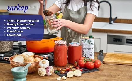 DAYANIKLI YAPILDI Dayanıklılık ve güvenilirliğe öncelik verdiğimiz için Sarkap konserve kapaklarını zamanın testini geçecek ve sızdırmaz, hava geçirmez ve mükemmel bir sızdırmazlık sağlayacak esnek bir metalden tasarladık. BPA içermez ve bulaşık makinesinde yıkanabilir, küçük cam konserve kavanozu kapaklarımız mutfağınız için ideal bir ektir. Bükümlü kapaklarımız, büküm pabucu kapakları gibi kırılmaz, rengi bozulmaz ve bozulmaz
