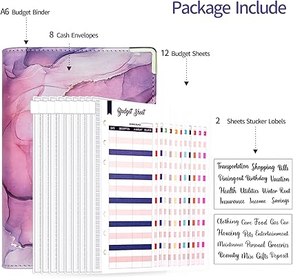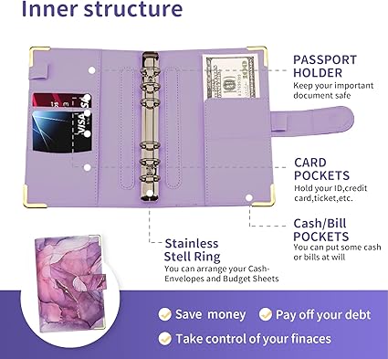 Bütçe Klasörü, A6 Mermer PU Deri Klasör, 6 Halkalı Bütçe Planlayıcı Düzenleyici, 8 Fermuarlı Nakit Zarfı, 12 Masraf Bütçesi Sayfası, Bütçeleme için 2 Harf Etiket Çıkartması, Para Tasarrufu (Mor)
