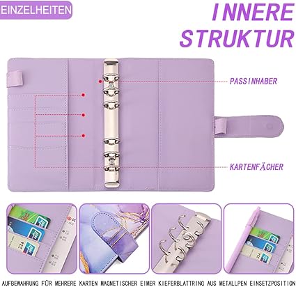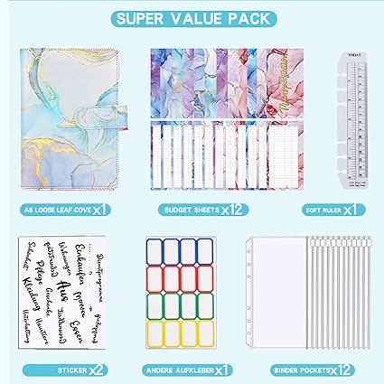 【Bütçe bağlayıcı A6】 Bütçe planlayıcımız poliüretan deriden bir A6 not defteri (6 halka, 4 kart bölmesi, 2 kalem halkası, 2 yan cep), 12 bağlayıcı cep, 12 adet bütçe yaprağı, 1 cetvel, 2 Alman çıkartması ve 16 adet kendinden yapışkanlı etiket, tüm pratik bütçe planlayıcı aksesuarları içerir, para yönetimi için idealdir ve daha iyi bir eşleşme için idealdir. Finansenin Finan’senin ZEN’e sahip olun.