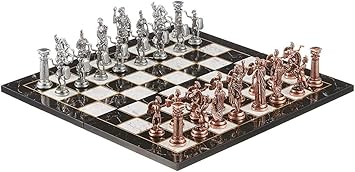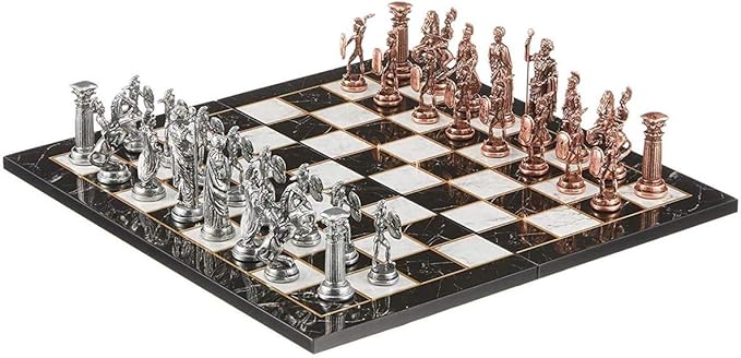 Büyük Boy Metal Roma Satranç Takımı Antik ve Katlanır Mermer Desenli MDF Ahşap Satranç Tahta (43×43 cm.)