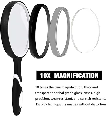 Resimleri daha net hale getirin: 10 x büyüteç camı, 7,5 cm/3 inç büyüteç lens, çizilmeye karşı dayanıklılık ve parlama önleyici fonksiyonu, okumanız için yeterli, çok rahat!