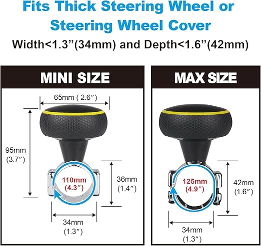 ✅【Daha büyük döndürücü】Diğer spinnerlere göre daha büyük tabanlı büyük direksiyon topuzu, çoğu otomobil, kamyon, traktör, çim biçme makinesi, forklift ve tekneler için uygundur; 3,3 cm – 4,1 cm arası direksiyon çapları için uygundur. Direksiyonunuz küçük bir çapa sahipse, lütfen birlikte verilen lastik şeritleri kullanın.