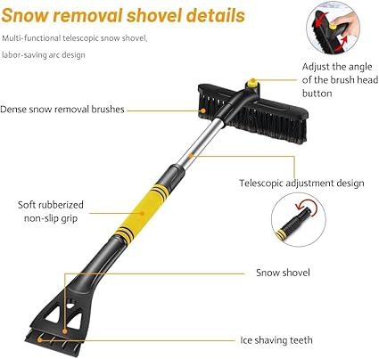 ☃【Dönen Kar Fırçası】Kar fırçası başlığı, çeşitli uygulamaların ihtiyaçlarını karşılamak için 360 ° dönebilen bir tasarıma sahiptir. Yatay ve dikey olarak kilitlenen düğmeye basarak kafayı kolayca döndürebilirsiniz, bu da fırçayı iş için en iyi açıya ayarlamanıza olanak tanır ve karı temizlemeyi kolaylaştırır.