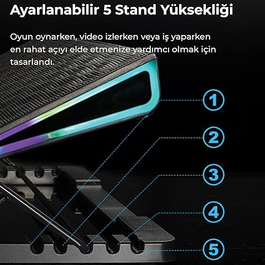 5 Yükseklik Ayarı Oyuncu dizüstü bilgisayar soğutucusu, seçilebilecek 5 çeşit ayarlanabilir yükseklik sağlar. Sırt ve boyun yorgunluğunu etkili bir şekilde gidermek için tasarlanmıştır, ihtiyaçlarınıza uygun açıyı ayarlayabilirsiniz.