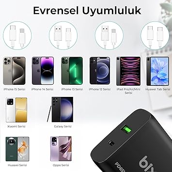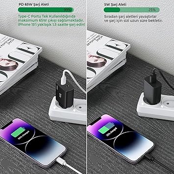 Type-C çıkışından 65W’a kadar sağladığı yüksek güç ile başta iPhone 15 olmak üzere tüm Apple cep telefonları ve Apple kulaklık / Apple saat için aynı anda şarj etmek veya Samsung cep telefonu + Samsung kulaklık / Samsung saat için aynı anda şarj etmek için de uygundur. Type-C ve USB portları hızlı şarj teknolojilerine sahiptir.