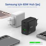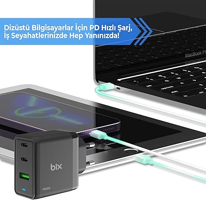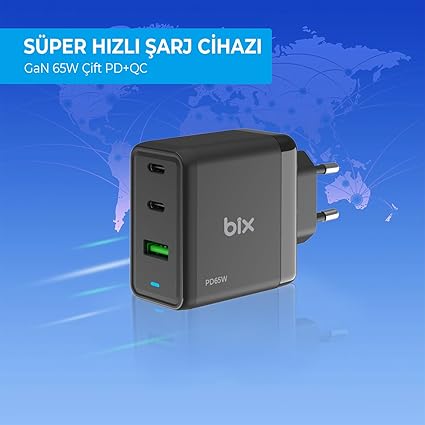 BX3P65G 65W GaN Qualcom 4.0 2*Type-C & USB-A 3 Portlu, MacBook Pro/Air, iPad Air/Pro, iPhone 16/15/14/14 Pro Max iPhone /13/13 Pro Max, Galaxy S24/S23/S22/S21 Uyumlu BX-3P65G