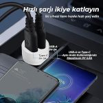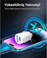 BXAC65C 65W PD Type-C & 18W USB-A Girişli Çift Portlu Hızlı Şarj Özellikli Araç İçi Şarj Cihazı Beyaz