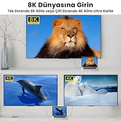 . 8K Görüntü Aktarımı: Cihazınızın DisplayPort Alternatif Modunu (Alt Mod) desteklemesi koşuluyla, video çıkışı için 60Hz’de 8K çözünürlüğü destekler. Çift akışlı 4K desteği ile 60 hz’de, tek akışlı 8K için olağanüstü video kalitesi sunar.
