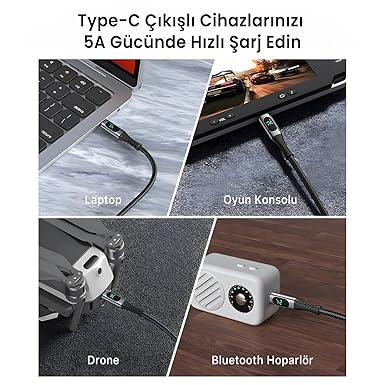 Geniş Uyumluluk: iPhone, Samsung, Xiaomi, Huawei başta olmak üzere tüm markaların Type-C girişli akıllı telefonları, akıllı saatler ve tabletler ile uyumludur. Ayrıca Macbook, Dell XPS, HP Spectre, Lenovo ThinkPad, Razer Blade, PS5 gibi birçok cihazla da uyumludur.